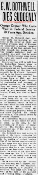 A George Bothwell married a Lilly Danforth in Arapaho Co., CO, 10/24/1880 and she later (1907) filed under her maiden name for a Civil War pension in CA. Unable to decipher the unit on the Civil War Pension Index information online but it did not appear to be anything close to the third Wisconsin Infantry. However, on the 1920 census, it appears the name given for George’s wife was Lilly D. Bothwell.